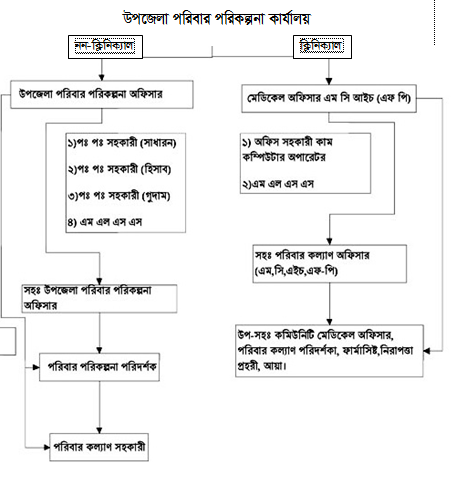 উপজেলা পরিবার পরিকল্পনা কার্যালয়ের অধিক্ষেত্র দুইটি। একটি হলো ক্নিনিক্যাল অন্যটি হলো নন-ক্নিনিক্যাল। দুই অধিক্ষেত্রে দুই কর্মকর্তা। নন-ক্নিনিক্যাল অধিক্ষেত্রে উপজেলা পরিবার পরিকল্পনা কর্মকর্তা এবং তাঁর অধীনে উপজেলা পরিবার পরিকল্পনা সহকারী ৩ জন, ইউনিয়ন ভিত্তিক পরিবার পরিকল্পনা পরিদর্শক এবং পরিবার কল্যাণ সহকারী বৃন্দ এবং ১ জন অফিস সহায়ক।ক্নিনিক্যাল অধিক্ষেত্রে উপজেলা মেডিকেল অফিসার (এমসিএইচ-এফপি) এবং তাঁর অর্ধীনে সেবা কেন্দ্র ভিত্তিক উপ-সহকারী কমিউনিটি মেডিকেল অফিসার, পরিবার কল্যাণ পরিদর্শিকা, অফিস সহায়ক, নৈশপ্রহরী ও আয়া বৃন্দ।